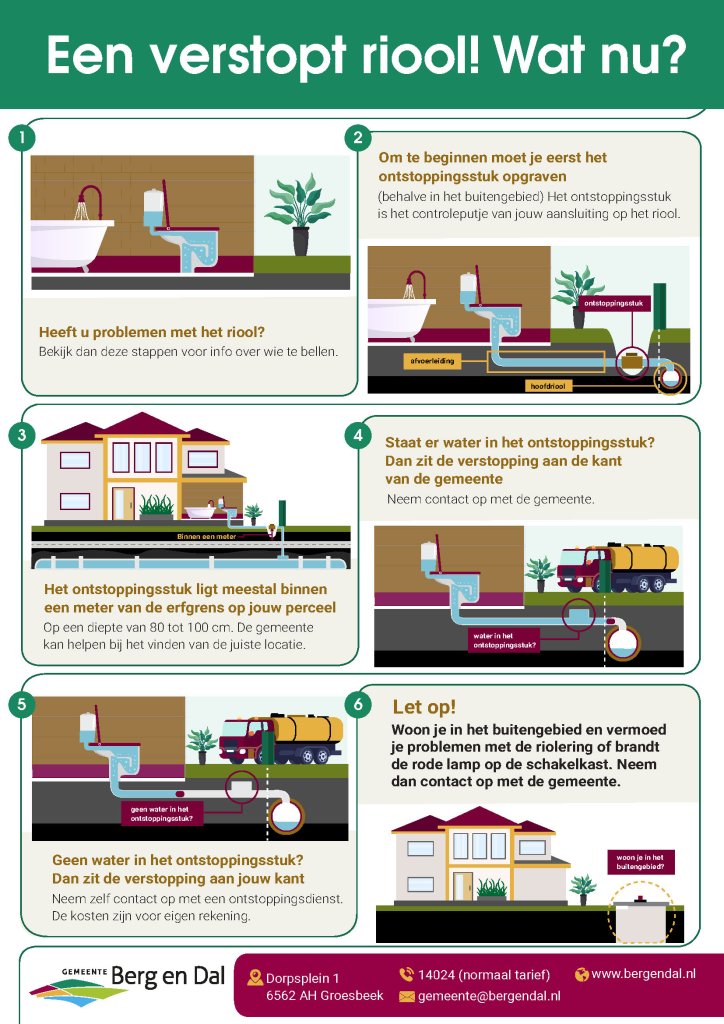 - Geen water in het ontstoppingsstuk? Dan zit de verstopping aan uw kant. Neem zelf contact op met een ontstoppingsdienst. De kosten zijn voor eigen rekening.
